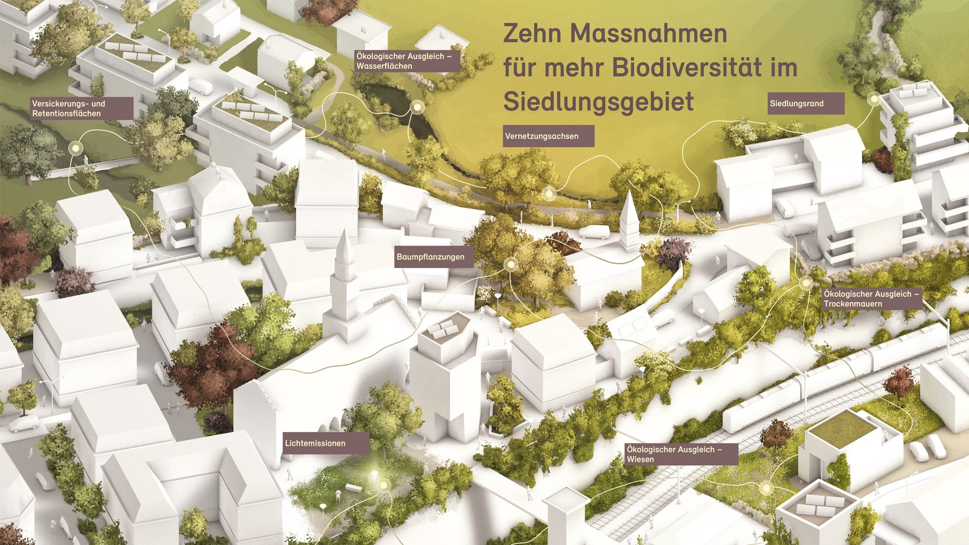 Die BAFU Publikation «Biodiversität und Landschaftsqualität im Siedlungsgebiet - Empfehlungen für Musterbestimmungen für Kantone und Gemeinde» unterstützt Kantone und Gemeinden darin, das Siedlungsgebiet naturnah und attraktiv zu gestalten.